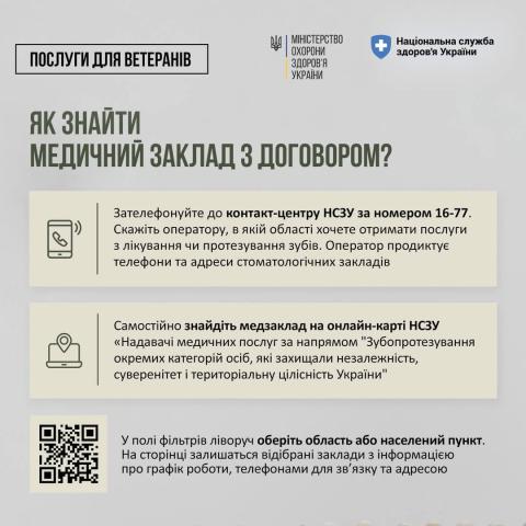 Знайти адресу та телефон найближчого медичного закладу можна: на сайті НСЗУ у розділі Аналітичні панелі “Надавачі медичних послуг за напрямом "Зубопротезування окремих категорій осіб, які захищали незалежність, суверенітет і територіальну цілісність України”або ж – на онлайн-карті НСЗУ.