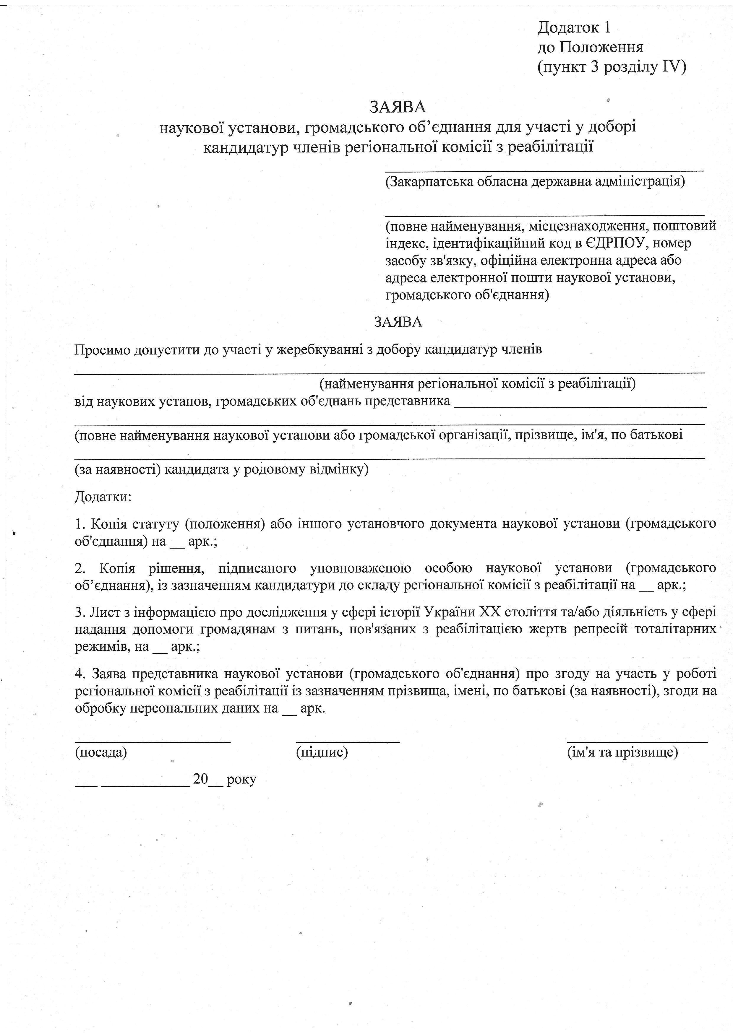 1) заява за формою, наведеною у додатку 1 наказу Міністерства культури України від 25.10.2018 року № 926 “Про затвердження Положення про Національну комісію з реабілітації та Типового положення про регіональну комісію з реабілітації”, зареєстрованого в Міністерстві юстиції України 12 листопада 2018 року за № 1281;