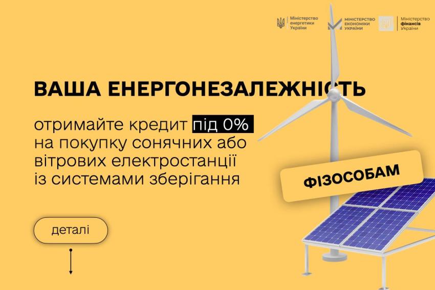 Фінансова підтримка надається фізичним особам, які встановлюють у власних домогосподарствах генерувальні установки, що виробляють електричну енергію з альтернативних джерел. Держава повністю компенсує відсоткову ставку по кредиту на покупку устаткування — сонячних або вітрових електростанції із системами зберігання.