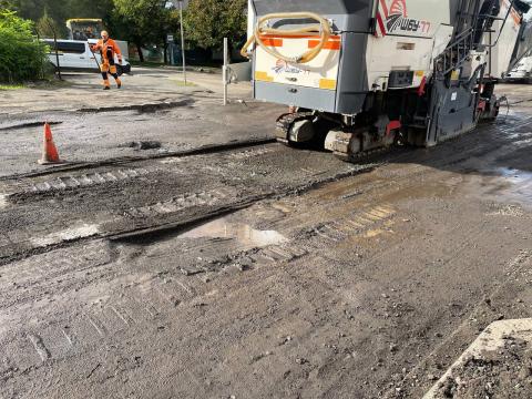 Ремонт автошляху протяжністю понад 100 метрів проводить підрядна організація ШБУ-77. Підрядник знімає верхній шар асфальту та встановлює новий висотою 8 см.