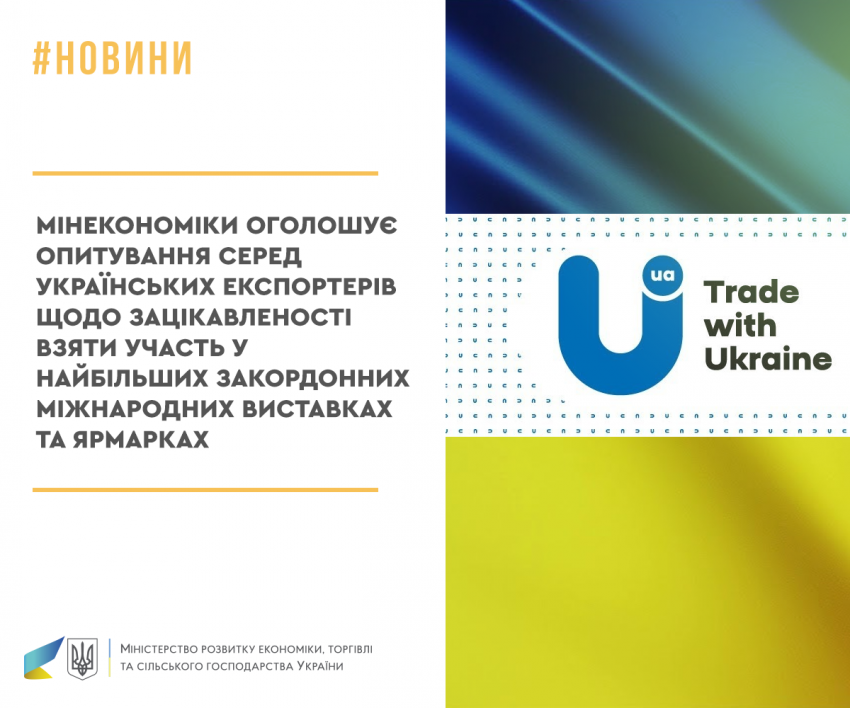 Міністерство розвитку економіки, торгівлі та сільського господарства України проводить масштабне опитування серед українських експортерів, галузевих та бізнес-асоціацій щодо зацікавленості взяти участь у найбільших закордонних міжнародних виставках та ярмарках.