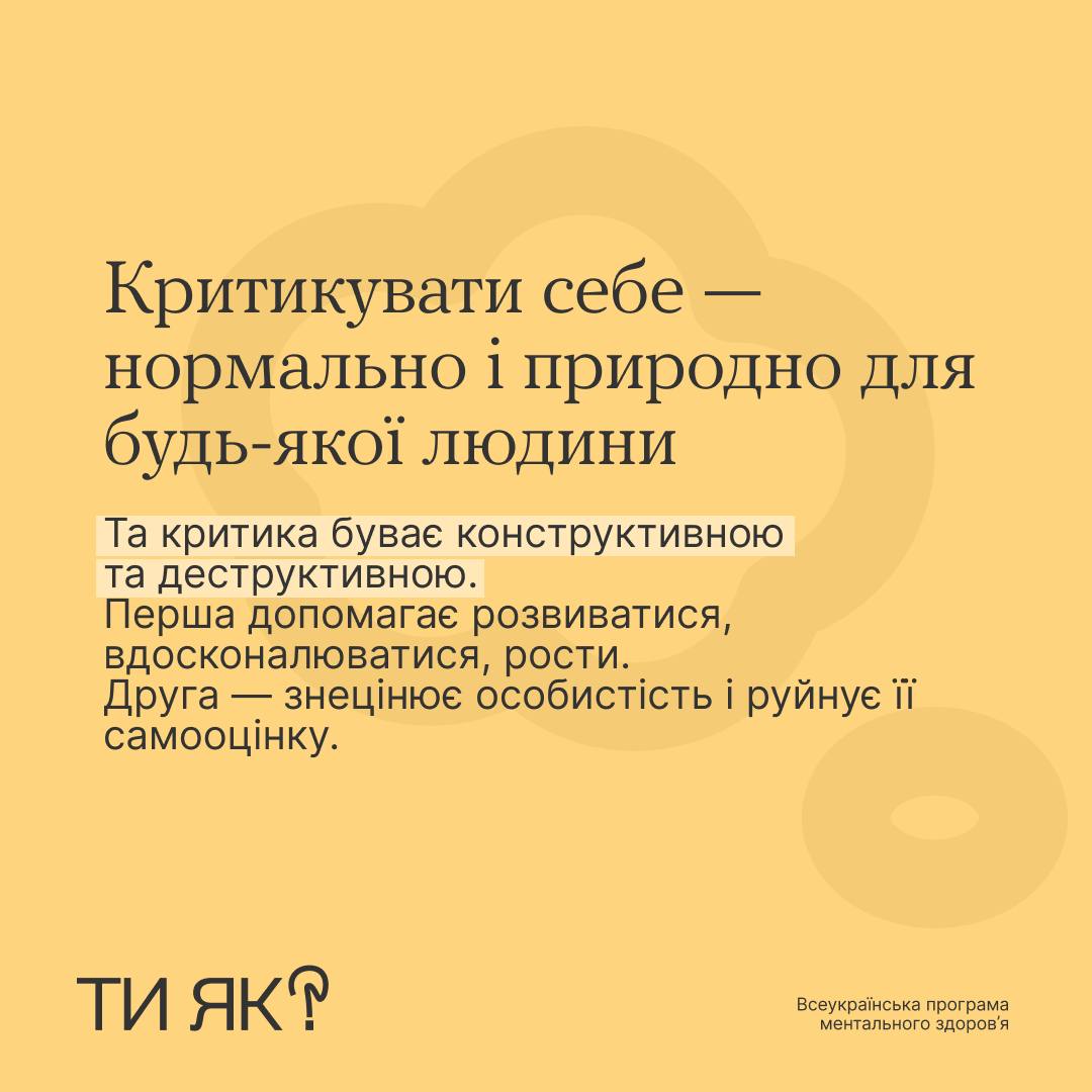 Внутрішній критик або ж самокритика інколи не дає нам нормально жити. Бо хто, як не ми, найкраще, найдеструктивніше себе покритикує, правда? Більше розповіли про самокритику і як з цим жити Остання зміна сторінки: 05-08-2024 13:25 Поширити