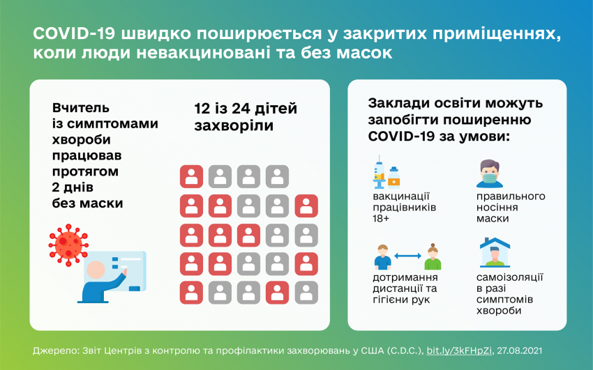 Наприклад, у США невакцинований вчитель заразив коронавірусом половину учнів та учениць у класі, а загалом захворіли 26 осіб. Про цей випадок у початковій школі округа Марін у Каліфорнії йдеться у звіті Центрів з контролю та профілактики захворювань у США (C.D.C.). Вчитель вперше відчув симптоми 19 травня, проте ще 2 дні викладав у класі, де навчається 24 дитини. Педагог не використовував маску, попри відповідну вимогу.