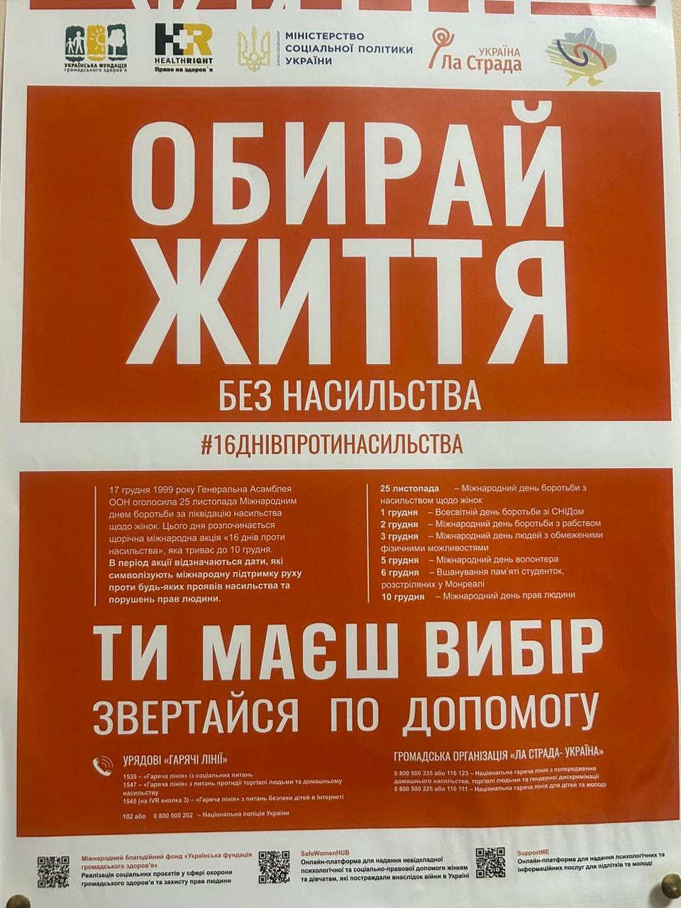 -хронологію важливих дат Всеукраїнської акції «16 днів проти насильства». Основна мета – привернення уваги до подолання домашнього насильства та насильства за ознакою статі, жорстокого поводження з дітьми, протидії торгівлі людьми та захисту прав жінок.   Статистичні дані по Мукачівському району по домашньому насильству та звернень осіб, які вважають себе постраждалими від торгівлі людьми
